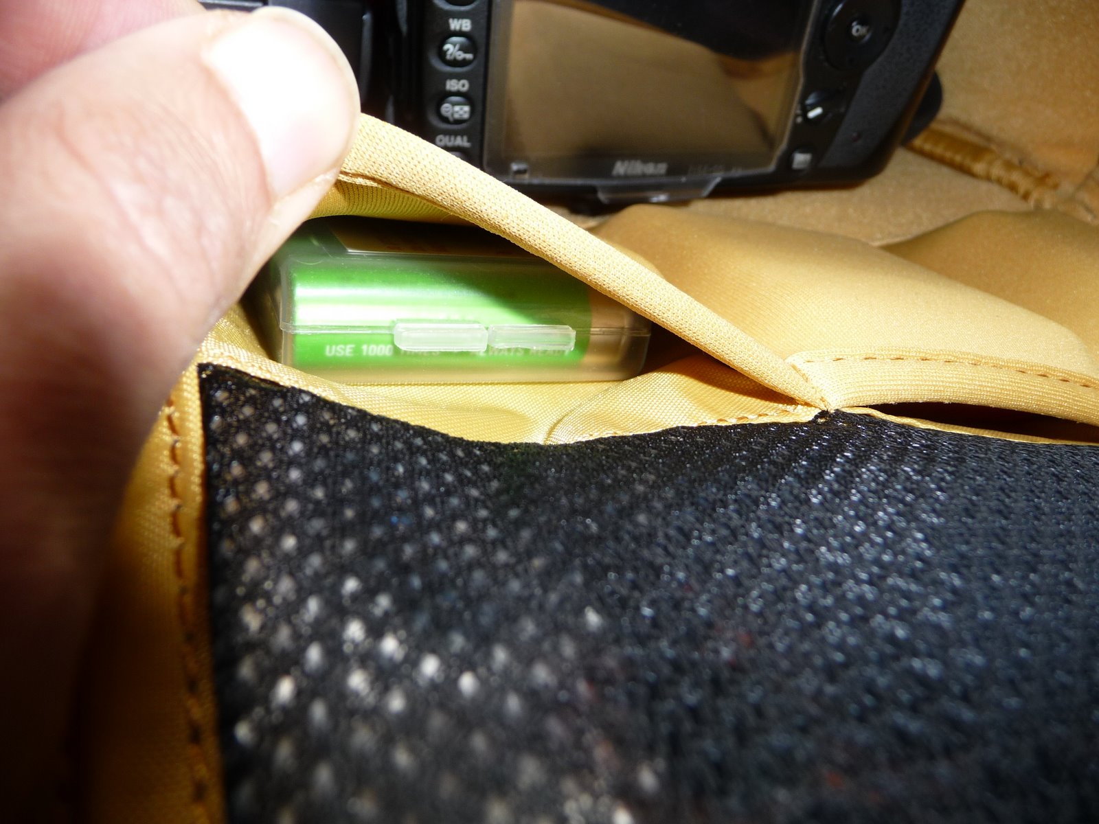 Je me ballade également avec dans la poche à filet une carte mémoire, des chiffons microfibres et des gélatines de couleurs pour le flash. Les 3 poches en néoprène accueillent une batterie de rechange et 2 jeux de piles AA pour le flash. En ce qui concerne les 3 poches à fermeture éclair extérieure de ce sac photo, j’en ai utilisée une seule pour le câble de l’alimentation. Pas encore d’idées pour les autres 🙂