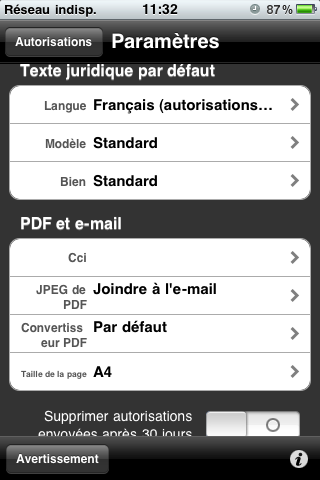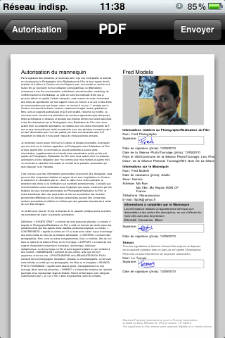 J’ai été agréablement surpris par le nombre de templates qui sont rédigés en plusieurs langues parmi lesquelles on trouve en Français pour des prise de vue en France et en Français pour des prises de vue hors France. Ceci laisse penser que les autorisations ont particulièrement bien été écrites en se posant bien les questions relatives au droit français. Cependant un avertissement stipule qu’il est de la responsabilité du photographe de vérifier de la légalité du document produit pour la séance qu’il a mené. (Ce qui est à mon humble avis normal pour une application que l’on paye moins de 10€…)